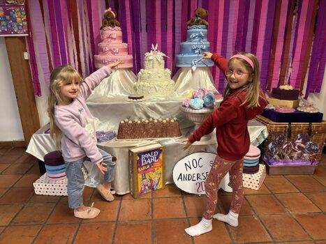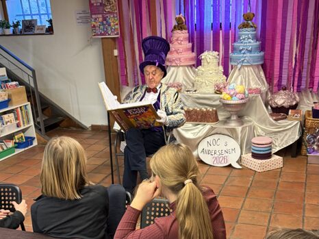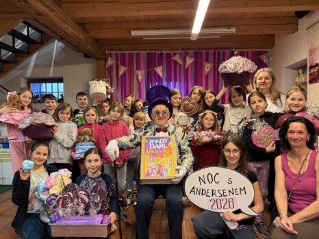 26. ročník Noci s Andersenem je úspěšně za námi. Letos nás osobně přivítal a do své továrny na čokoládu pozval sám Willy Wonka! Zůstat však mohl jen ten, kdo měl dostatek štěstí – našel minci, zakoupil čokoládu a objevil v ní Zlatý kupon. Poté nás čekala řada sladkých výzev: zdolávání čokoládové řeky, hod maxibonbonů do krabice, poznávání čokolády se zakrytýma očima pouze po čichu nebo vymýšlení vlastní cukrovinky se superschopností. Nechyběla ani společná večeře. Každý si také ušil velikonočního zajíčka – sice ne čokoládového, ale o to hezčího. S jehlou a nití si nakonec bravurně poradili úplně všichni. Někteří zajíci pak „doskákali“ až do naší vlastnoručně vyrobené výzdoby z dortů a sladkostí. Závěr večera patřil tombole o knihy Roalda Dahla. Každý odvážný nocležník si odnesl originální pamětní pohlednici a poté už následovalo čtení ve spacáku před spaním.