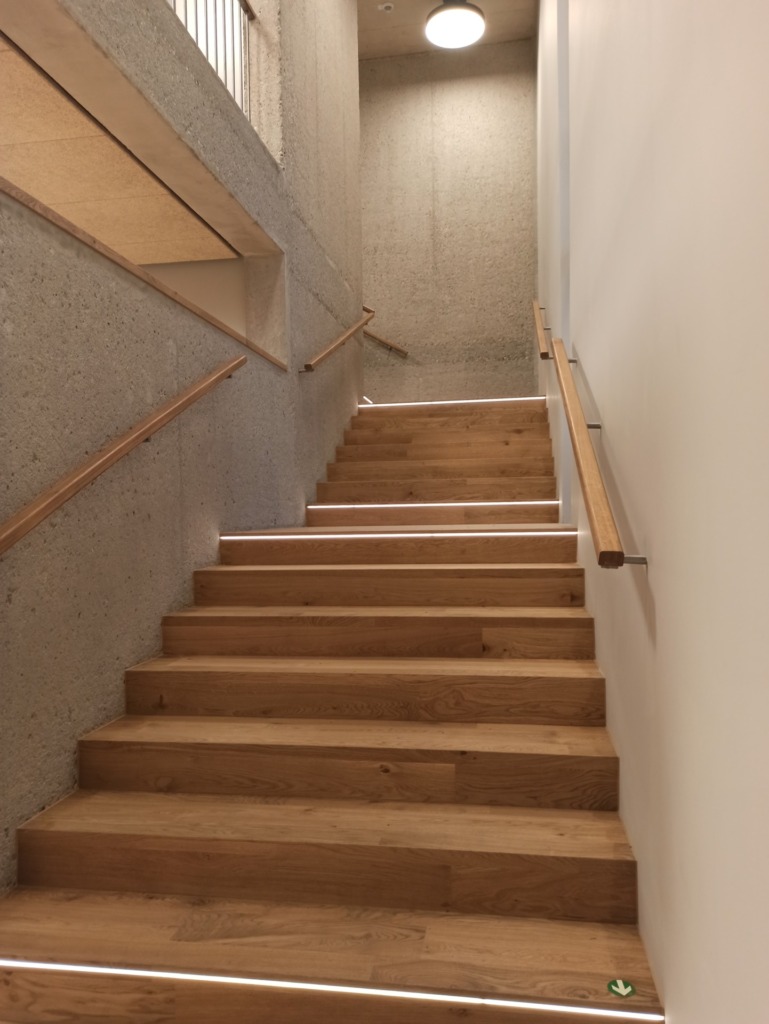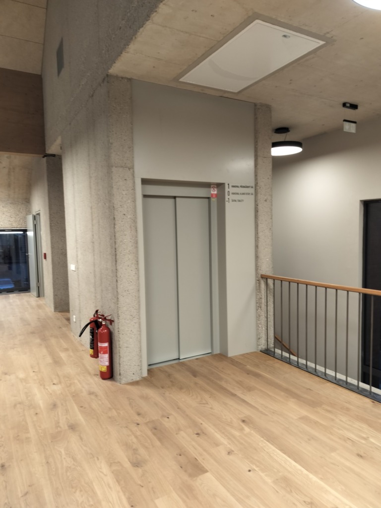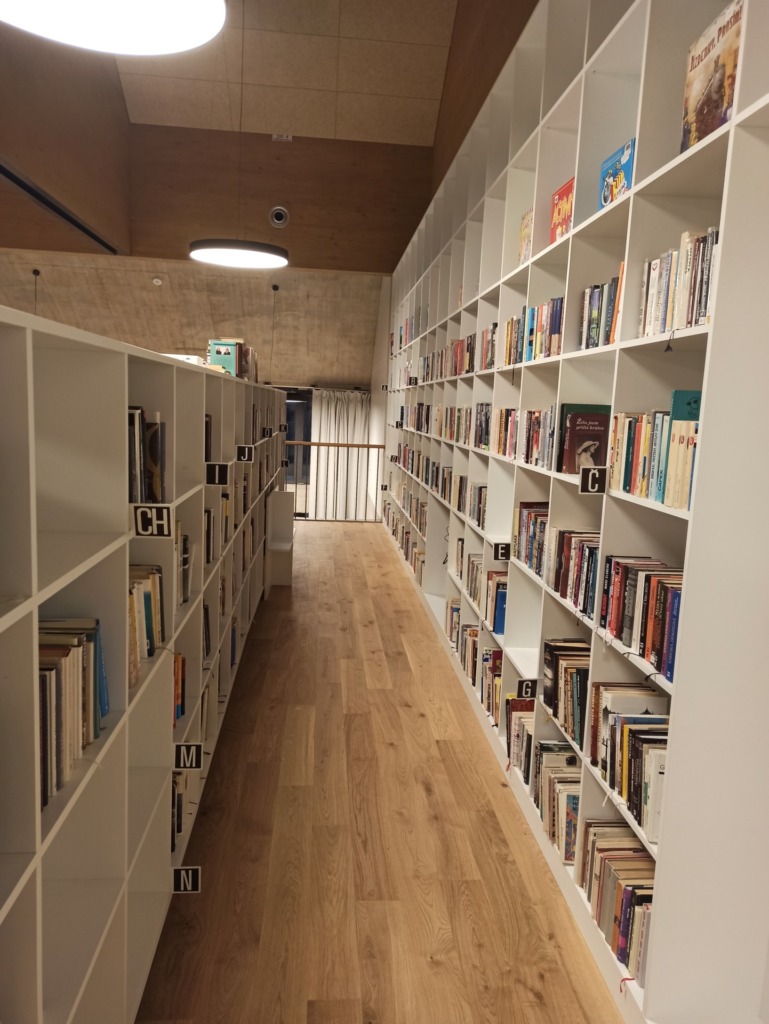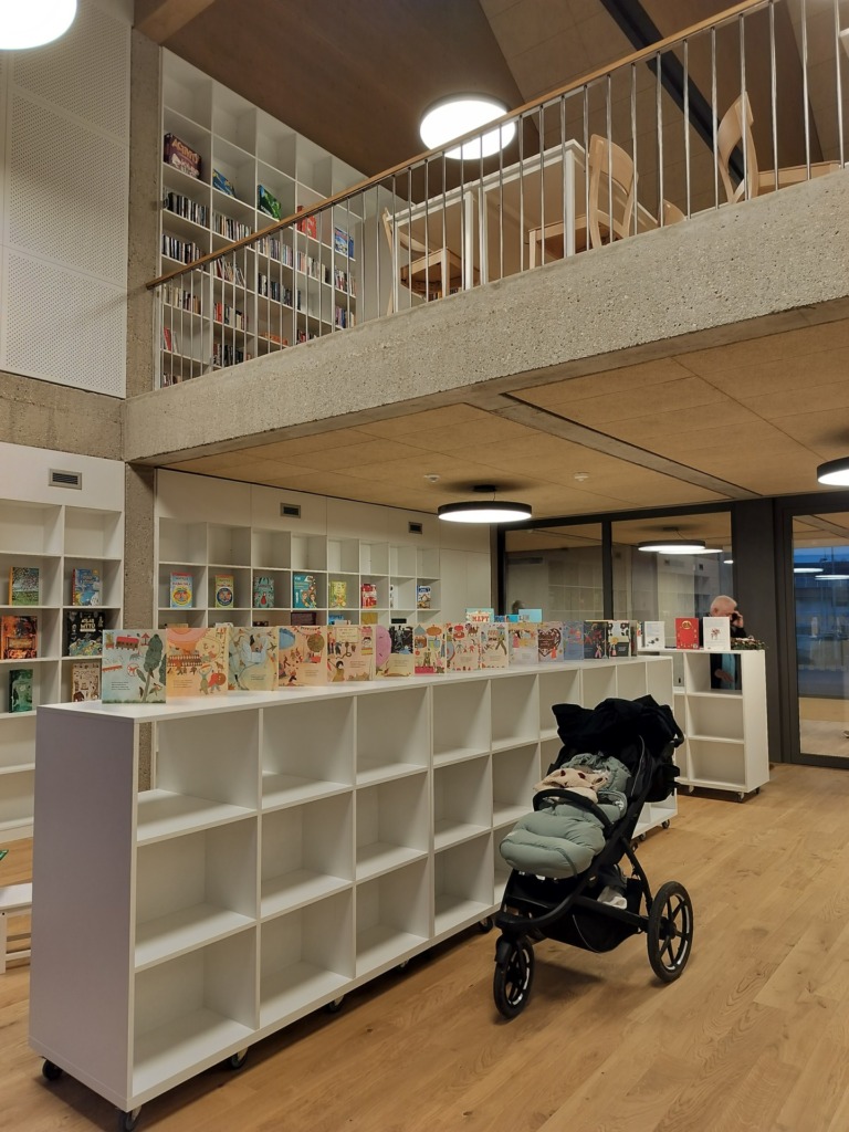 Interiér knihovny je světlý, otevřený a velmi příjemný. V přízemí najdeme pult knihovnice, selfcheck, dětský koutek a prostor na uložení knih. V prvním patře mohou čtenáři využít studijní místa, najít si další potřebné knihy nebo využít klidnější prostor v mírně klidnější čítárně. Nízké regály jsou opatřeny praktickými kolečky a tedy je možné je v případě potřeby přesunout.
